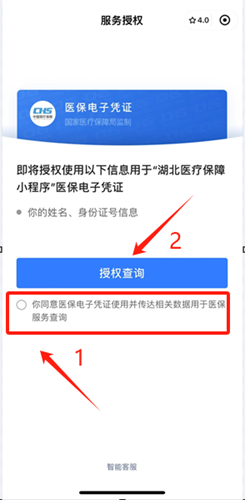 進(jìn)入到電子憑證授權(quán)頁(yè)面后,勾選“你同意電子醫(yī)保憑證使用并傳達(dá)相關(guān)數(shù)據(jù)用于醫(yī)保服務(wù)查詢”,并點(diǎn)擊“授權(quán)查詢”。