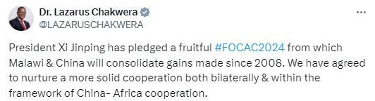 馬拉維總統(tǒng)查克維拉發(fā)文表示,馬拉維和中國(guó)將在雙邊和中非合作框架內(nèi)培育更穩(wěn)固的合作。
