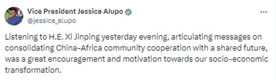 烏干達(dá)副總統(tǒng)阿盧波9月5日發(fā)文表示,昨天晚上聆聽了習(xí)近平主席關(guān)于鞏固中非命運(yùn)共同體合作的講話,對(duì)我們推進(jìn)社會(huì)經(jīng)濟(jì)轉(zhuǎn)型發(fā)展是極大的鼓舞和激勵(lì)。
