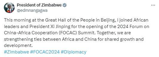 9月5日峰會(huì)開幕當(dāng)天,津巴布韋總統(tǒng)姆南加古瓦發(fā)文表示:今天上午,我在北京人民大會(huì)堂與非洲各國(guó)領(lǐng)導(dǎo)人和習(xí)近平主席共同出席了2024年中非合作論壇峰會(huì)開幕式。我們共同努力,加強(qiáng)中非關(guān)系,促進(jìn)共同增長(zhǎng)和發(fā)展。