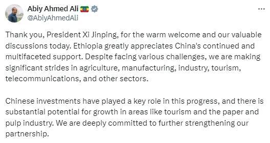 埃塞俄比亞總理阿比9月4日在社交媒體發(fā)文表示:感謝習(xí)近平主席的熱情接待和我們今天的寶貴會(huì)談。埃塞俄比亞非常感謝中國(guó)持續(xù)和多方面的支持。