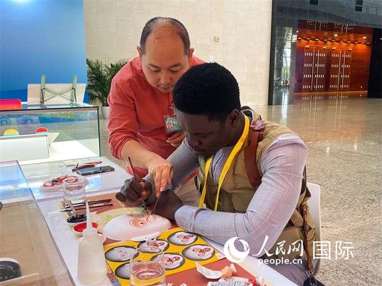 非洲媒體記者在新聞中心體驗彩塑京劇臉譜。人民網(wǎng)記者 于洋攝
