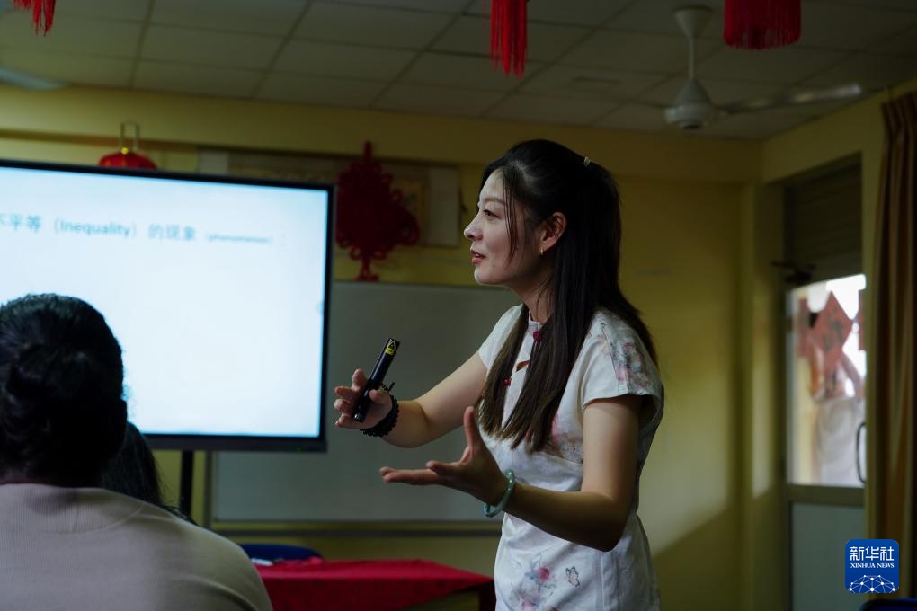 9月4日,在位于斯里蘭卡中央山脈南麓的薩伯勒格穆沃大學(xué),中國教師夏子涵正在為孔子課堂漢語專業(yè)的學(xué)生授課。新華社記者 伍岳 攝