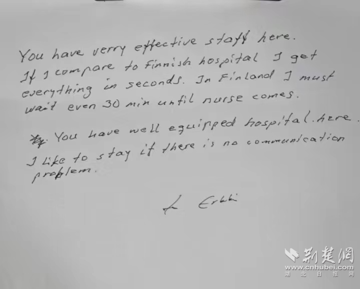 荊楚網(wǎng)(湖北日報(bào)網(wǎng))訊(記者葉修頎 通訊員袁曼)9月8日,孝感市中心醫(yī)院呼吸與危重癥醫(yī)學(xué)科II病區(qū)的芬蘭患者羅斯塔蒂克在出院之際,留下了一封手寫感謝信,雖短短數(shù)語,卻是他由衷的感謝,字里行間,真情流露。