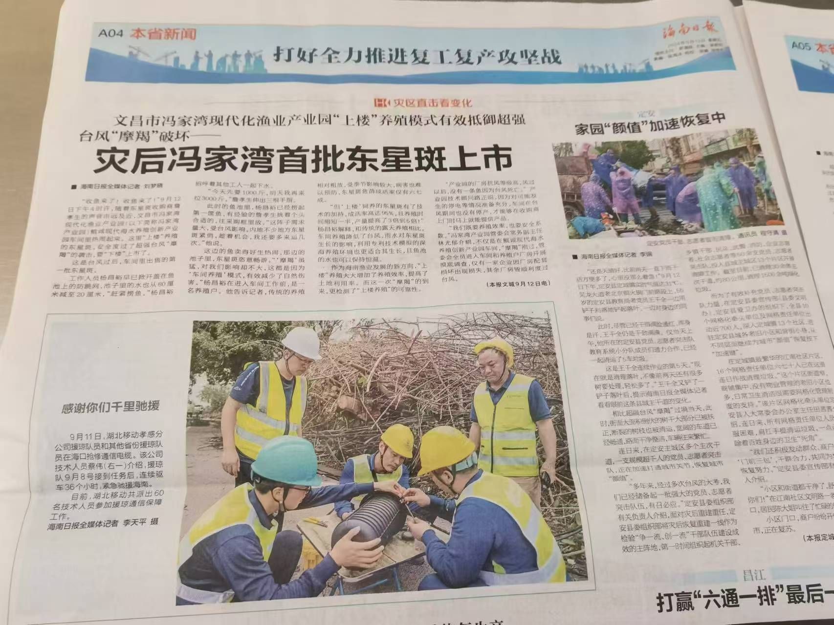 荊楚網(wǎng)(湖北日報網(wǎng))訊(通訊員、李圭軍)9月6日今年第11號超強臺風(fēng)“摩羯”,先后在海南文昌市、廣東徐聞縣登陸,當(dāng)?shù)赝ㄐ旁O(shè)施受損嚴(yán)重,保障通信抗災(zāi)救災(zāi)任務(wù)繁重,在中國移動湖北公司的統(tǒng)一部署調(diào)度下,孝感移動聞“風(fēng)”而動、踐行央企責(zé)任,星夜馳援海南搶修通信,保障“生命線”暢通,用實際行動踐行紅色通信的初心,為人民群眾的生命財產(chǎn)安全保駕護(hù)航。