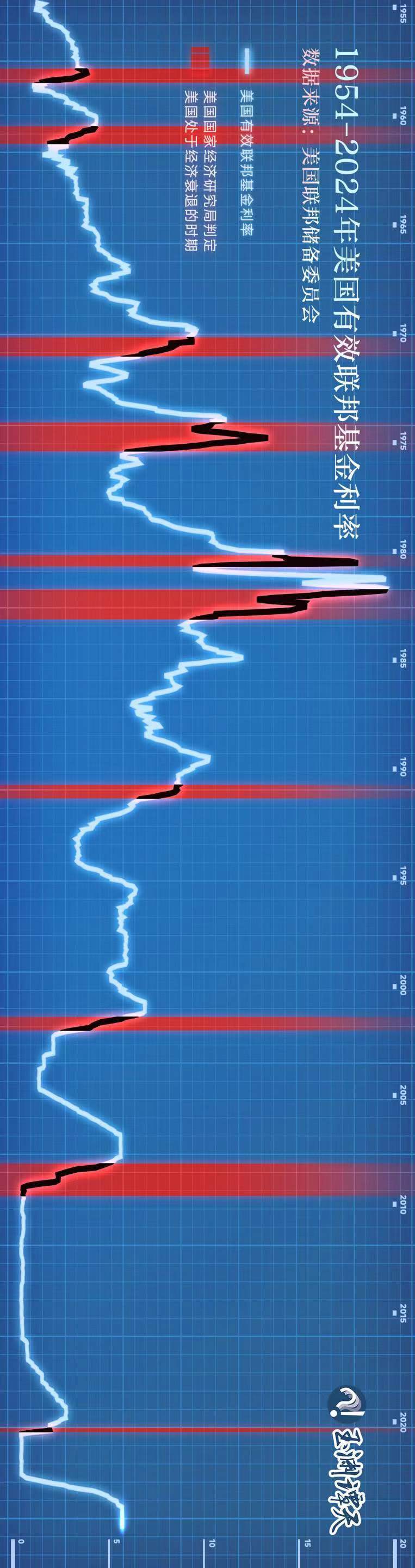 這張美國(guó)有效聯(lián)邦基金利率(Effective Federal Funds Rate)的圖中,紅色陰影區(qū)域是美國(guó)國(guó)家經(jīng)濟(jì)研究局(National Bureau of Economic Research)判定美國(guó)處于經(jīng)濟(jì)衰退的時(shí)期。