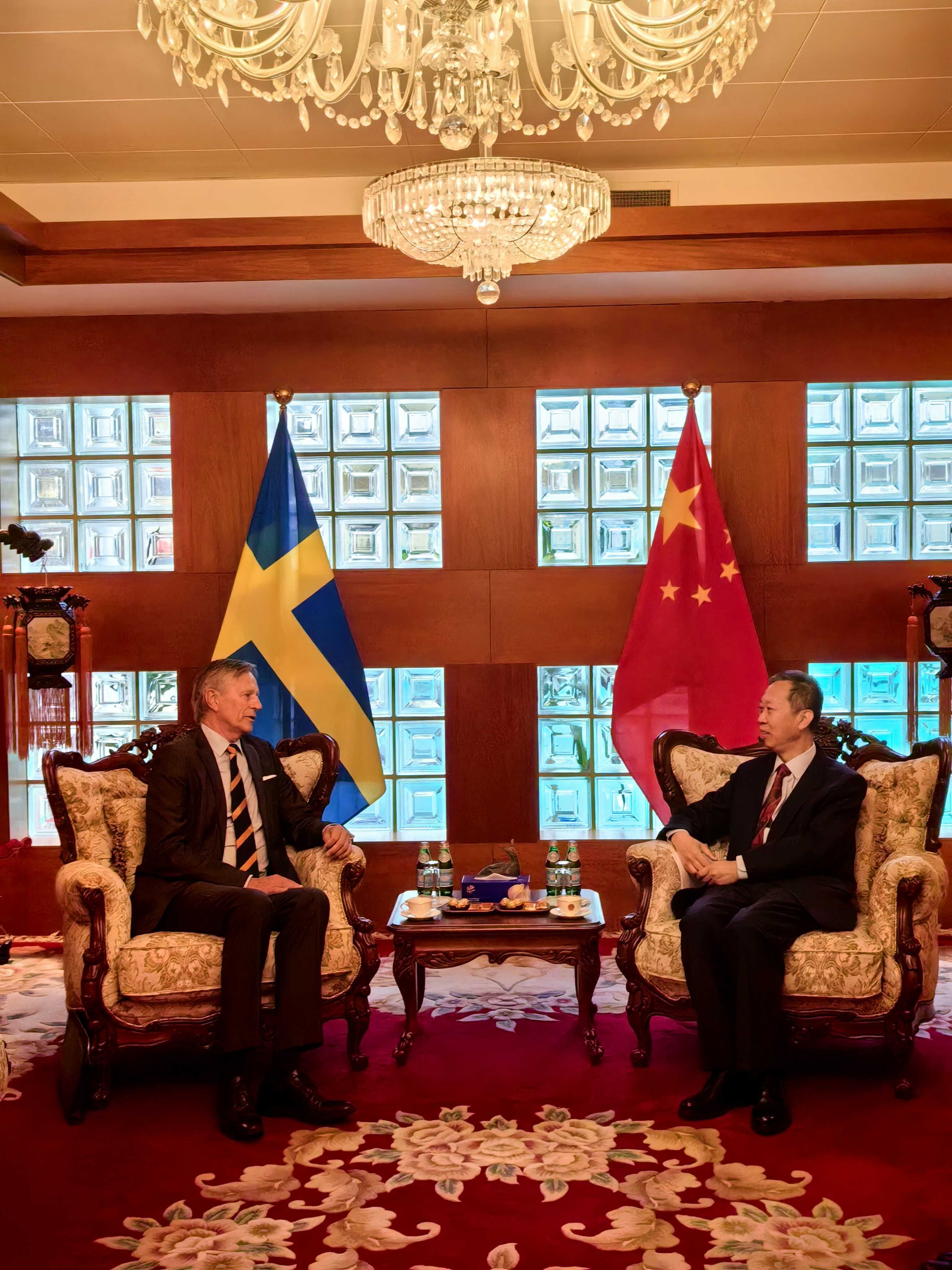 中國駐瑞典大使崔愛民會見中國瑞典商會新任主席萬納努斯。中國駐瑞典大使館供圖
