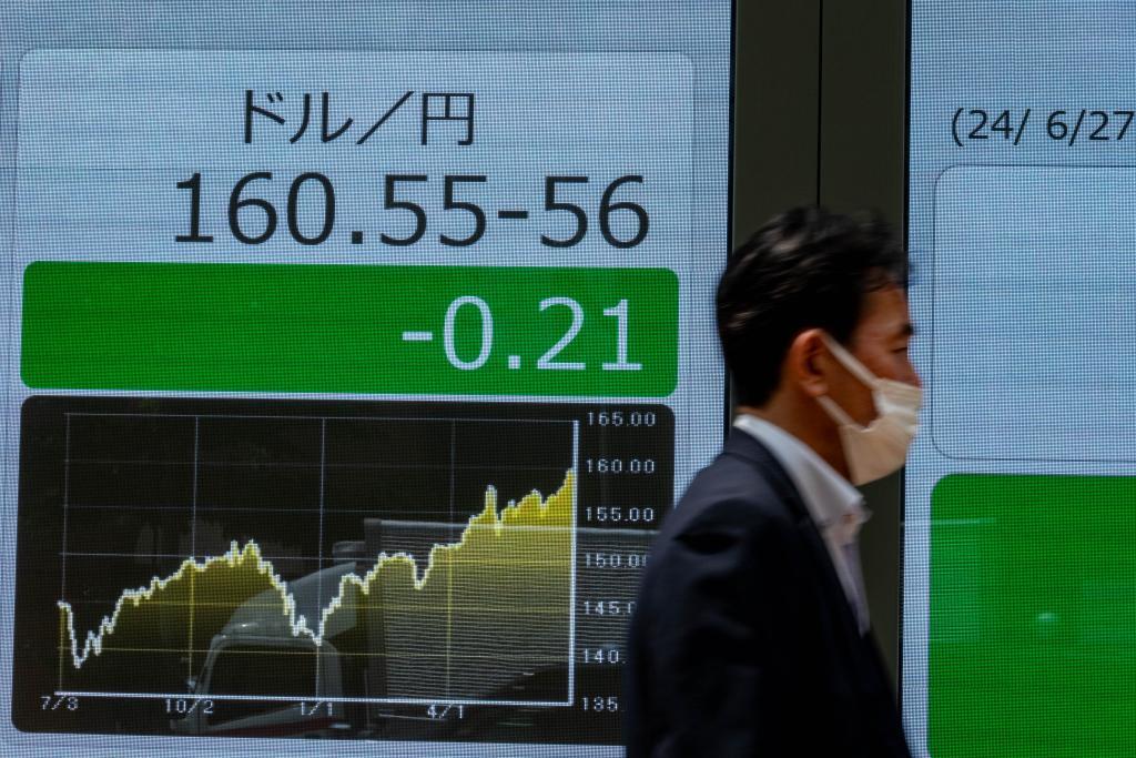 6月27日,行人走過日本東京一處顯示實時匯率的電子屏幕。新華社記者張笑宇攝
