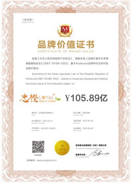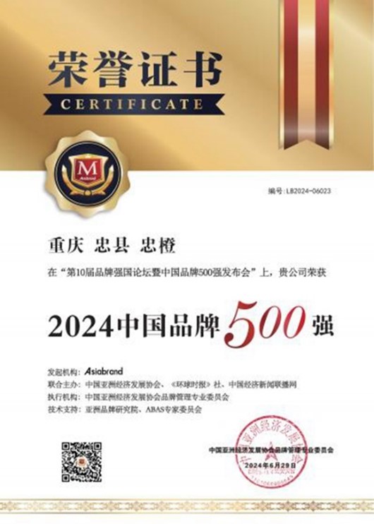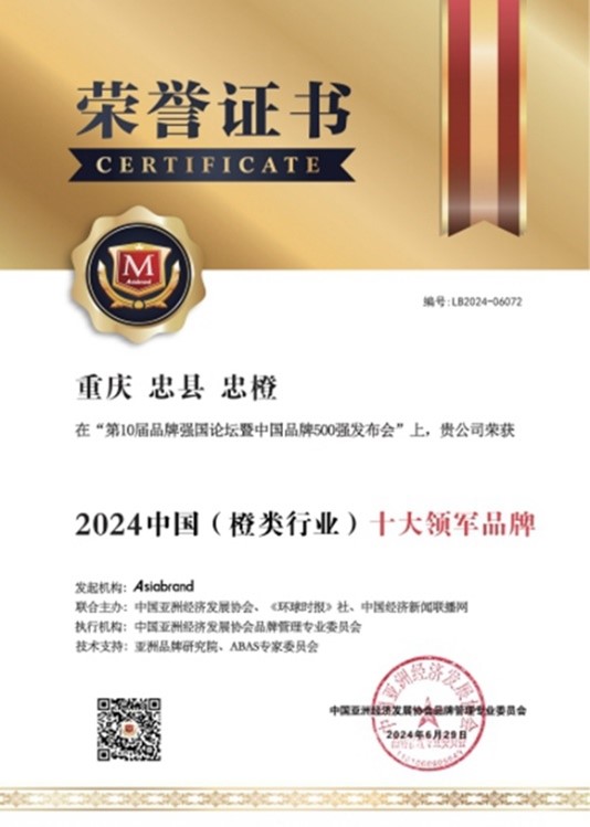 目前,“忠縣柑橘”已獲國家質檢總局地理標志保護認證,今年6月,第10屆品牌強國論壇在北京舉行。會上,忠縣忠橙憑借卓越品質與品牌影響力,獲得“2024中國品牌500強”“2024中國(橙類行業(yè))十大領軍品牌”兩項榮譽,其品牌價值躍升至105.89億元,標志著忠縣忠橙品牌建設取得歷史性突破。