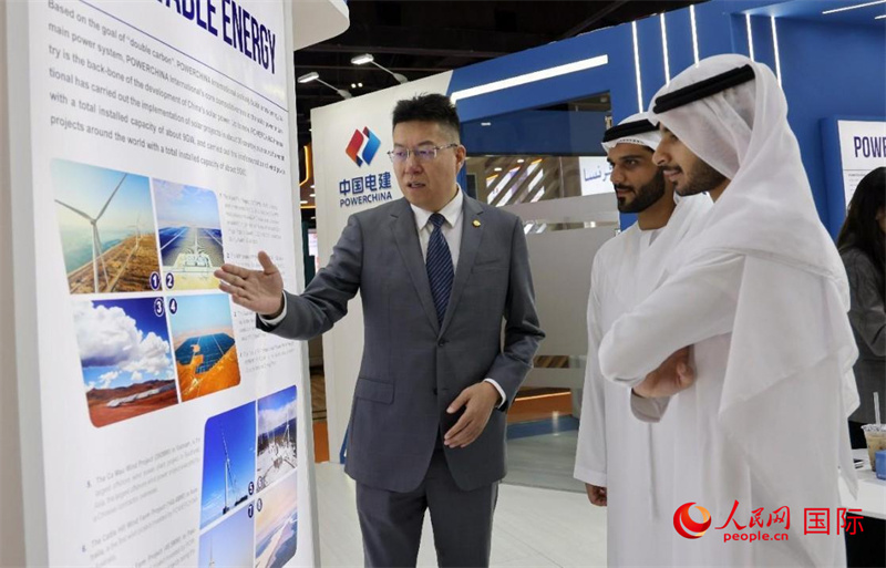 中國(guó)電建中東北非區(qū)域總部負(fù)責(zé)人向觀眾介紹公司承建的可再生能源項(xiàng)目。人民網(wǎng)記者 管克江攝