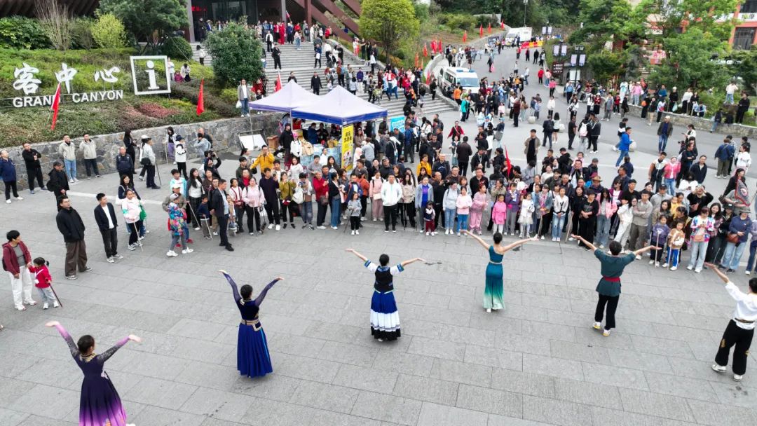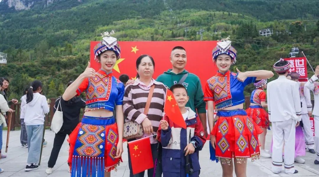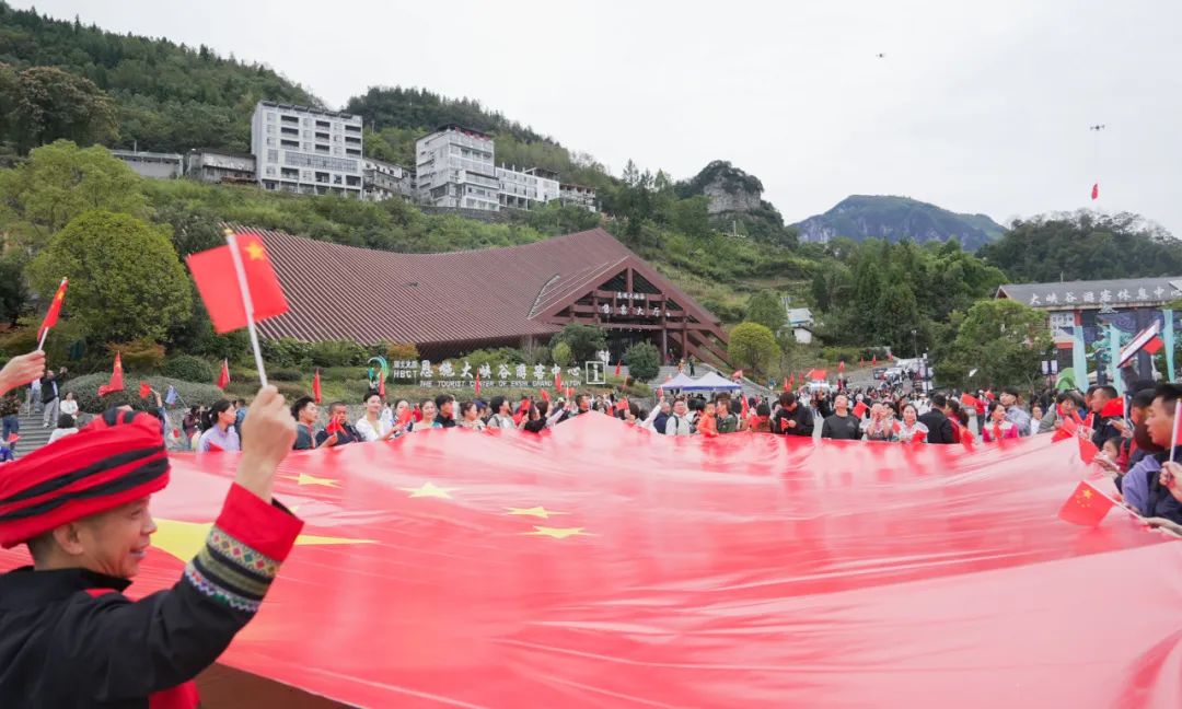 恩施大峽谷景區(qū)組織“盛世華誕 國(guó)旗飛揚(yáng)”快閃活動(dòng)。大型無(wú)人機(jī)懸掛國(guó)旗在峽谷飛行,游客同跳擺手舞,同唱《我和我的祖國(guó)》,現(xiàn)場(chǎng)游客激動(dòng)不已,歡呼聲、吶喊聲響徹整個(gè)峽谷。聊天式講解、鼓勵(lì)式爬山、還送拍照攝影服務(wù)的“陪爬”志愿者最“搶手”。假期間景區(qū)連續(xù)達(dá)到游客峰值。