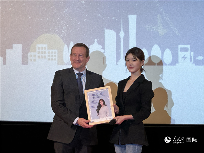 10月10日,法國駐華大使白玉堂(左)為中國演員趙露思(右)頒發(fā)“第十一屆中法環(huán)境月推廣大使”稱號。人民網(wǎng) 謝瑩攝