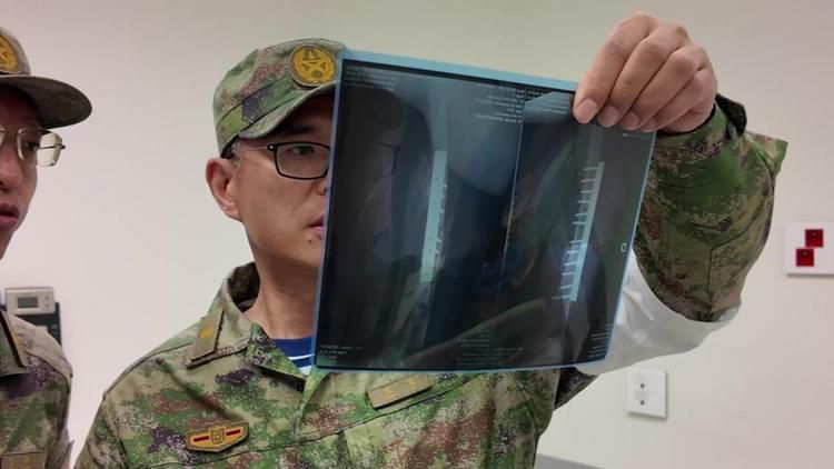 “和平方舟”號醫(yī)院船骨科醫(yī)生陳宜:綜合患者病史、查體及X線檢查,我們判斷傷員為右腿脛腓骨中段骨折。綜合他的身體條件和傷情,我們幾位骨科醫(yī)生研究后決定為傷員實施“骨折手法復位+石膏固定術”。