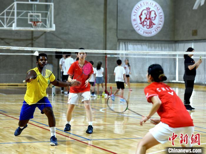 當(dāng)?shù)貢r(shí)間10月12日,巴西圣保羅,中國(guó)高校羽毛球代表團(tuán)和巴西羽毛球協(xié)會(huì)運(yùn)動(dòng)員切磋球技。 中新社記者 林春茵 攝