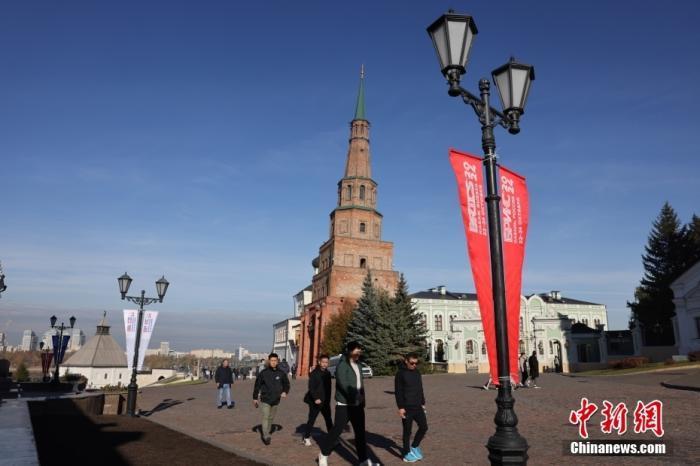 當(dāng)?shù)貢r(shí)間10月20日,俄羅斯喀山大街上懸掛著金磚峰會(huì)條幅。金磚國(guó)家領(lǐng)導(dǎo)人第十六次會(huì)晤于2024年10月22日至24日在俄羅斯喀山舉行。中新社記者 盛佳鵬 攝