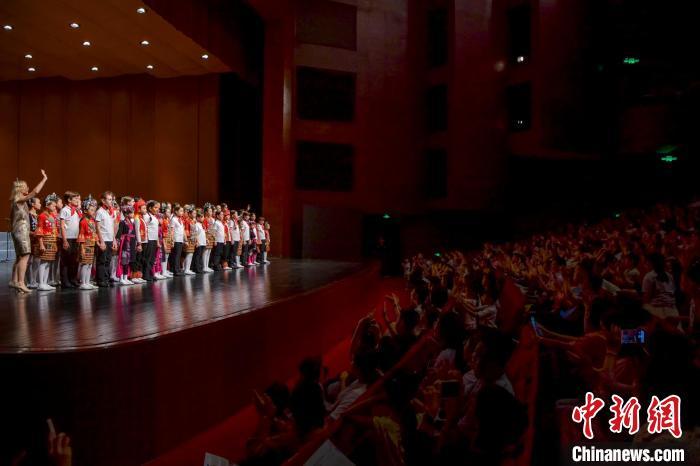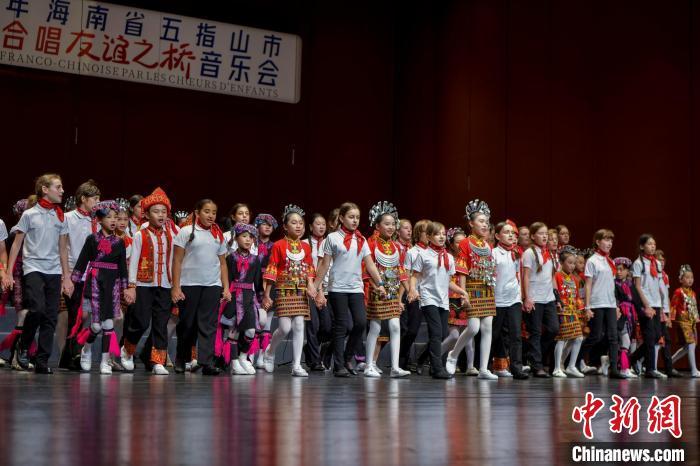 10月25日晚,來(lái)自法國(guó)的巴黎寶麗聲童聲合唱團(tuán)和海南五指山黎苗童聲合唱團(tuán),在海南省歌舞劇院聯(lián)袂合唱經(jīng)典歌曲《友誼天長(zhǎng)地久》。中新社記者 駱云飛 攝