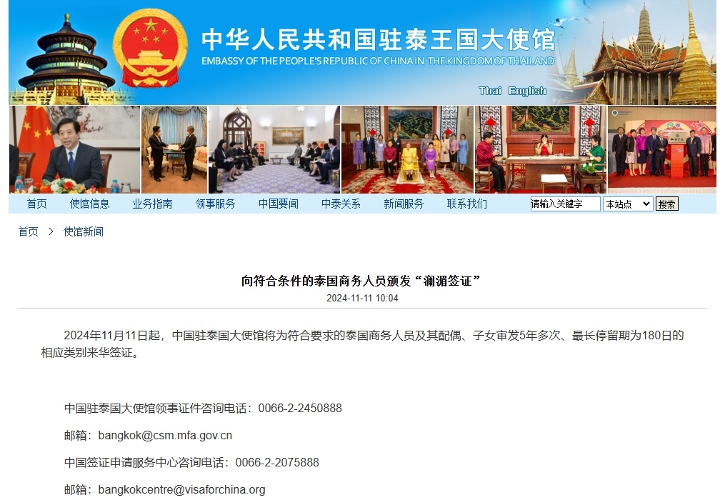 央視網(wǎng)消息:據(jù)中國駐泰國大使館消息,2024年11月11日起,中國駐泰國大使館將為符合要求的泰國商務人員及其配偶、子女審發(fā)5年多次、最長停留期為180日的相應類別來華簽證。
