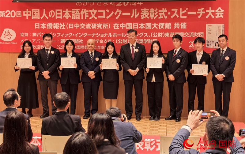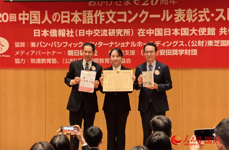 人民網(wǎng)北京11月16日電 (記者陳建軍)11月15日下午,由日本僑報社主辦的第20屆中國人日語作文大賽頒獎典禮暨日語演講大會在北京舉行。大連外國語大學三年級學生林芳菲憑借《“完美”朋友——小夢教給我的事情》一文獲得最優(yōu)秀獎“日本大使獎”,日本駐華大使金杉憲治為其頒獎。