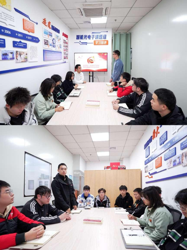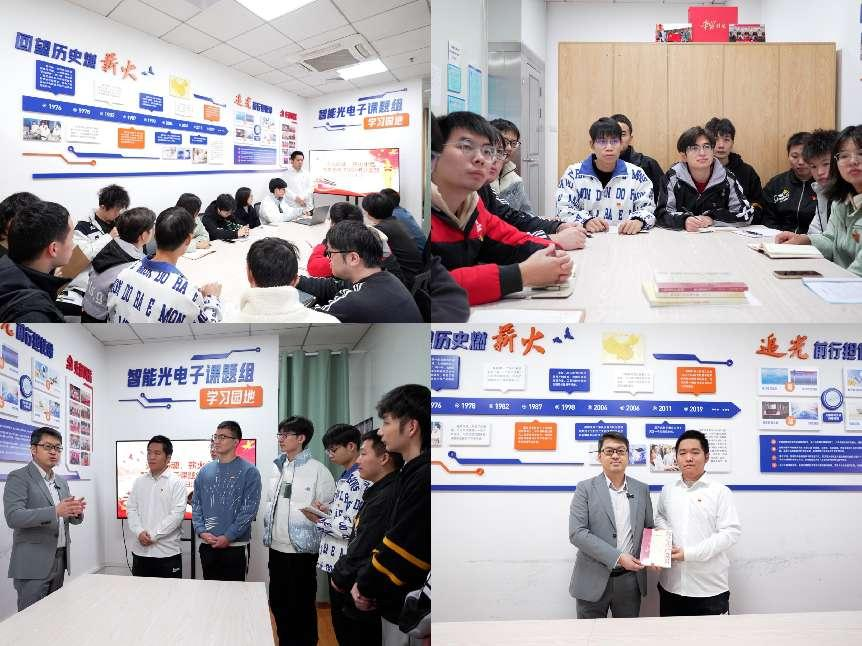 11月18日,支部書記胡臨風(fēng)在鑒湖主樓608課題組學(xué)習(xí)園區(qū)主持理論學(xué)習(xí)活動,深入解讀黨的二十大和二十屆二中、三中全會關(guān)于教育科技人才工作的重要部署?;顒友埨钫f教授講授“回顧光纖發(fā)展史,追光鑄魂育新人”的專題知識,李教授描繪了光纖技術(shù)的發(fā)展歷程,并指引了黨支部的未來發(fā)展方向——黨建與科研同向同行,讓黨支部的堡壘作用和黨員的先鋒模范作用在科研一線充分發(fā)揮。李教授還向支部贈予《我是共產(chǎn)黨員——科學(xué)報國帶頭人》等書籍,鼓勵黨員們投身科研一線,矢志奮斗報國。