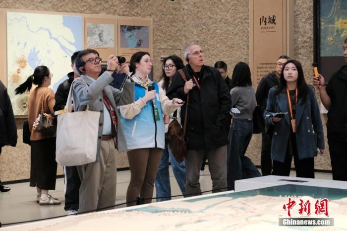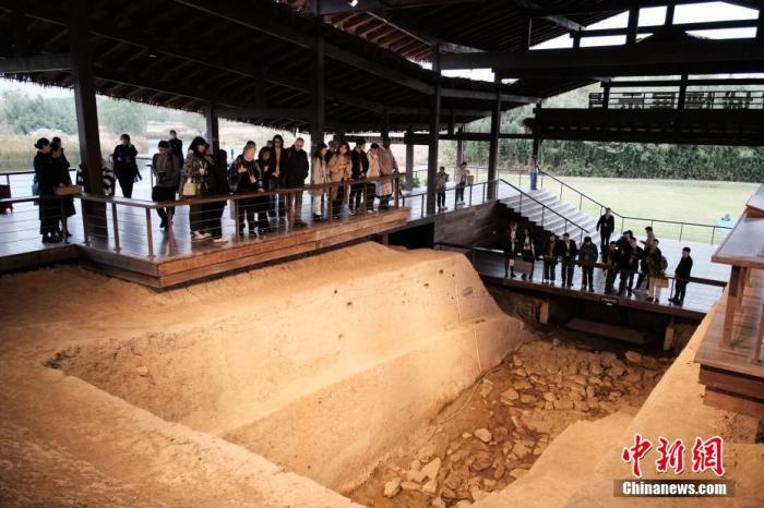 11月25日,浙江杭州良渚博物院,考古學家在館內(nèi)拍照留念。中新社記者 曹丹 攝