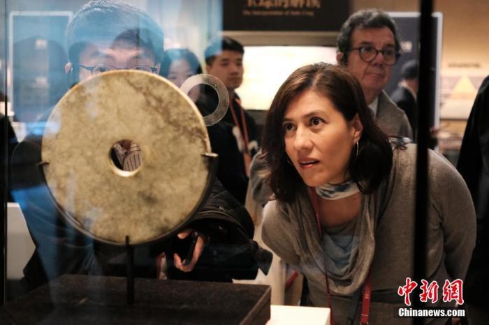 11月25日,浙江杭州良渚博物院,墨西哥考古學家、策展人帕特里西婭在良渚玉璧前駐足細看。中新社記者 曹丹 攝