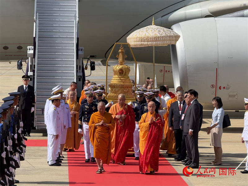 北京靈光寺佛牙舍利抵達泰國曼谷廊曼軍用機場。人民網(wǎng)記者 章念生攝