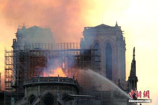 當(dāng)?shù)貢r(shí)間2019年4月15日晚,巴黎圣母院發(fā)生大火,受損嚴(yán)重。大批消防人員在現(xiàn)場(chǎng)進(jìn)行撲救。中新社記者 李洋 攝