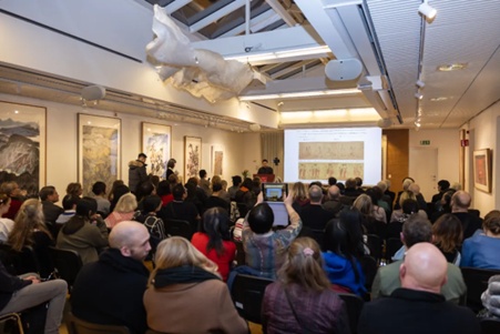 燕東升介紹了中國(guó)畫(huà)中蘊(yùn)含的中國(guó)美學(xué)精神,及中瑞藝術(shù)交流的淵源與現(xiàn)狀,希望觀眾可以跟隨中國(guó)藝術(shù)家們的作品,享受一次美好的藝術(shù)之旅,并誠(chéng)摯邀請(qǐng)大家到中國(guó),感受中國(guó)的美景與美食,感受古老中國(guó)的青春活力。