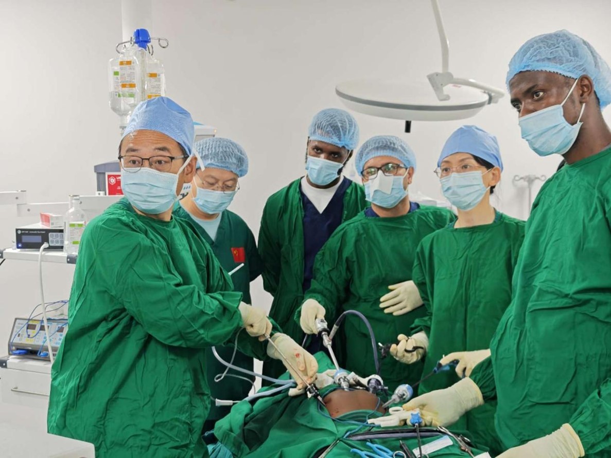 中外醫(yī)師合作進行腹腔鏡手術。中國援桑醫(yī)療隊供圖