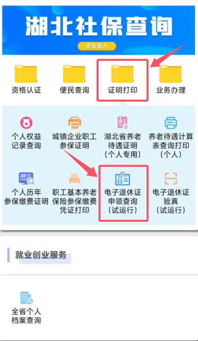 第二步:進入“湖北12333服務(wù)大廳”后,下劃至“湖北社保查詢”,在該欄目下的【證明打印】中選擇“電子退休證申領(lǐng)查詢”,點擊進入,詳見圖③。