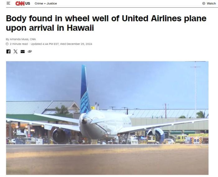 中新網(wǎng)12月26日電 據(jù)美國有線電視新聞網(wǎng)(CNN)報道,當?shù)貢r間12月25日,美國聯(lián)合航空公司發(fā)布聲明稱,24日從芝加哥出發(fā)的美聯(lián)航202航班抵達夏威夷的毛伊島后,在飛機主起落架的輪艙內(nèi)發(fā)現(xiàn)一具尸體。
