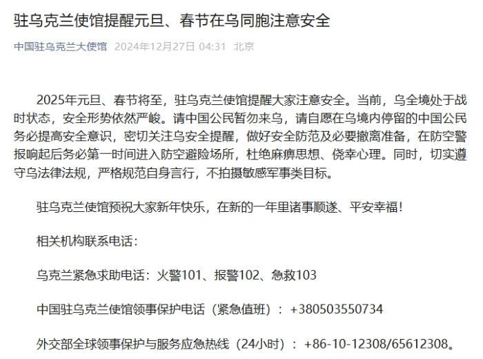 中新網(wǎng)12月27日電 據(jù)中國駐烏克蘭大使館消息,2025年元旦、春節(jié)將至,中國駐烏克蘭使館提醒在烏中國公民注意安全。