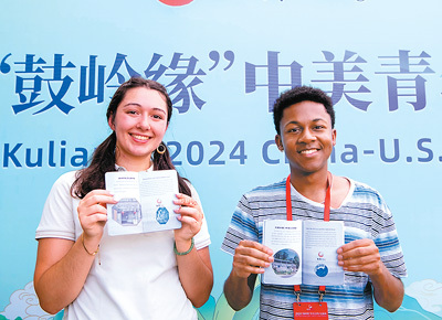 參加2024“鼓嶺緣”中美青年交流周活動的兩名學生代表展示在鼓嶺“打卡”“蓋章”。