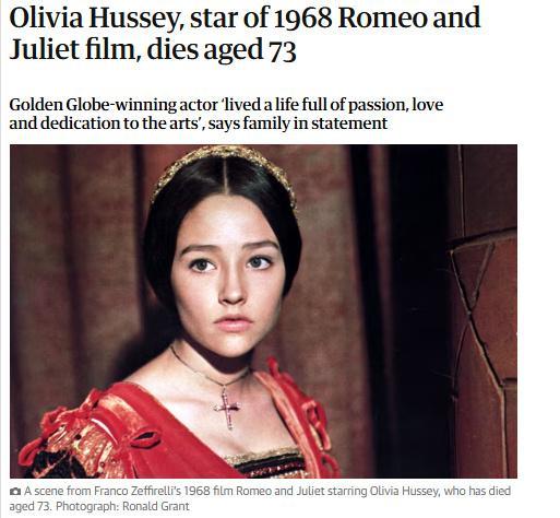 中新網(wǎng)12月29日電 據(jù)英國(guó)《衛(wèi)報(bào)》、英國(guó)廣播公司(BBC)報(bào)道,當(dāng)?shù)貢r(shí)間12月27日,曾在電影《羅密歐與朱麗葉》中飾演朱麗葉一角的女演員奧麗維婭·赫西(Olivia Hussey)去世,享年73歲。