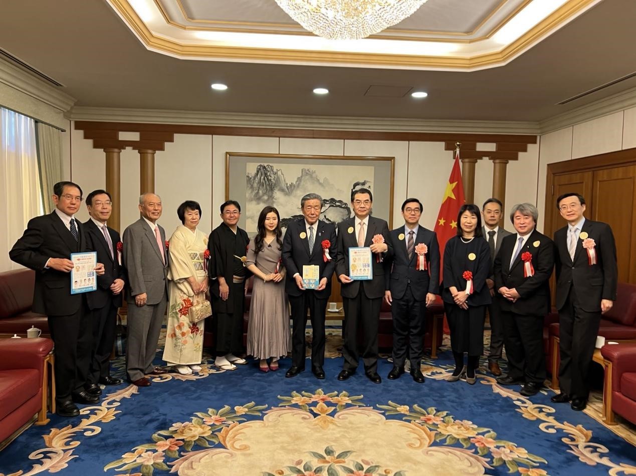 儀式開始前吳大使和森山干事長會見獲獎者代表。日本僑報社供圖