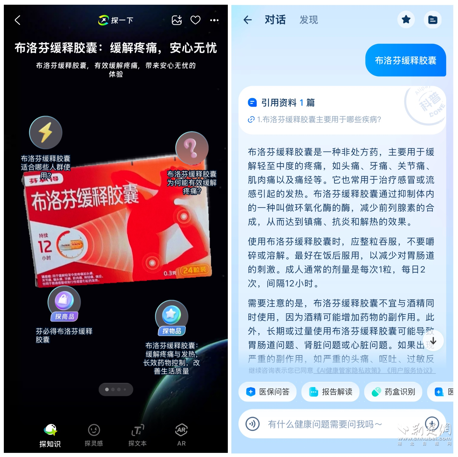 遇到讀不懂的外文商品,探一下就能獲取詳情,更方便線(xiàn)上買(mǎi)同款;家里丟了說(shuō)明書(shū)的藥盒,不僅可查到詳細(xì)介紹,還能調(diào)用支付寶旗下“AI健康管家”追問(wèn)更多的用藥須知。