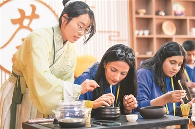 2024年4月15日,2024年“漢語(yǔ)橋”上海合作組織國(guó)家青年學(xué)生春令營(yíng)開(kāi)營(yíng)儀式在新疆師范大學(xué)舉行。來(lái)自8個(gè)上合組織國(guó)家的近500名青年學(xué)生參加了此次春令營(yíng)。圖為參加春令營(yíng)的來(lái)華青年學(xué)生在新疆師范大學(xué)學(xué)生(左)的指導(dǎo)下學(xué)習(xí)茶藝。