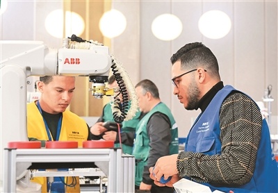 2024年12月18日,第三屆上合組織國(guó)家職工技能大賽在青島市開(kāi)幕。圖為來(lái)自埃及的易卜拉欣·穆西·赫爾米·穆西(前右)與穆斯塔法·霍斯尼·穆斯塔法·梅特瓦利(前左)在工業(yè)機(jī)器人操作調(diào)整工項(xiàng)目比賽中。