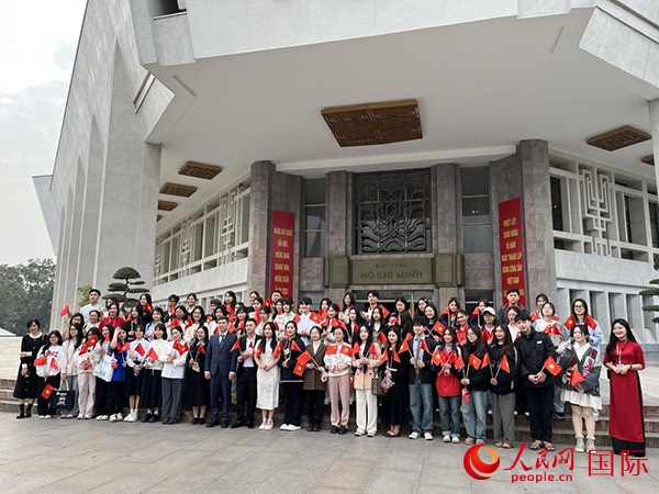 中越兩國青年學子在胡志明博物館前合影留念。人民網(wǎng)記者 楊曄攝