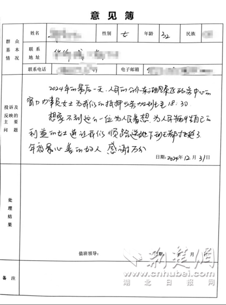 面對(duì)如此高效而貼心的服務(wù),鄭女士深受感動(dòng)。她在意見簿上情不自禁地寫道:“人民公仆……為人民著想……年度最心善的好人,感謝萬分!”簡(jiǎn)短的文字凝聚了鄭女士對(duì)東湖不動(dòng)產(chǎn)登記窗口工作人員的深深敬意和感激之情。