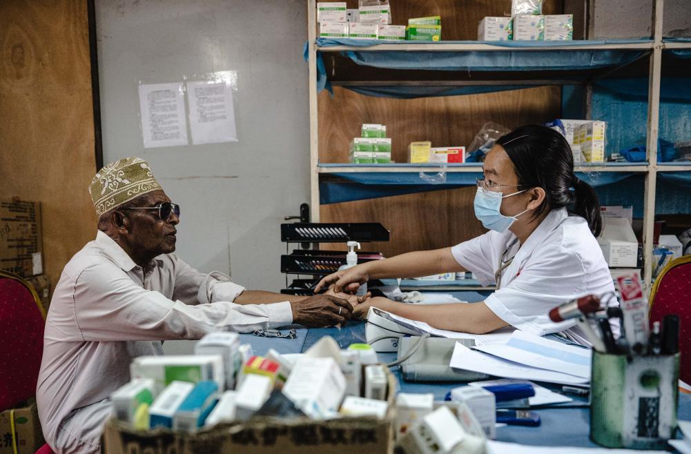 2024年1月11日,中國第15批援科摩羅醫(yī)療隊隊長潘春熹在位于科摩羅首都莫羅尼的馬魯夫醫(yī)院內(nèi)為患者看病。新華社記者王冠森攝