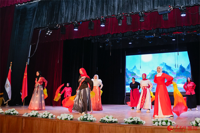 四川外國(guó)語(yǔ)大學(xué)的留學(xué)生們獻(xiàn)上大合唱《鮮花》與埃及方言節(jié)目,精彩生動(dòng)的表演贏得了現(xiàn)場(chǎng)熱烈的掌聲。蘇伊士運(yùn)河大學(xué)孔子學(xué)院的八名同學(xué)則獻(xiàn)上了舞蹈《浮光》,舞姿行云流水,韻味十足?,旣悂喤c米拉合作的舞蹈《美哉!詩(shī)經(jīng)》,展現(xiàn)了中國(guó)古典文化的優(yōu)雅與美感。趙惜音與諾蘭表演的歌舞《燈火里的中國(guó)》將現(xiàn)場(chǎng)氣氛推向高潮,歌聲與舞步交織出濃厚的節(jié)日氛圍。