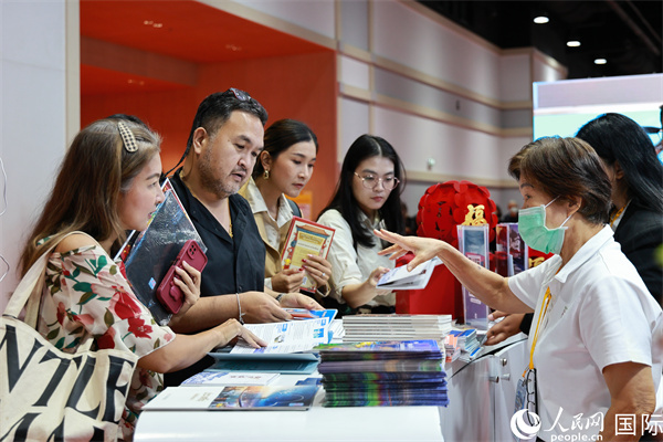 外國觀眾在中國展臺仔細閱讀赴華旅游介紹,向工作人員咨詢關于中國美食和景點的詳細信息。人民網記者 白元琪攝