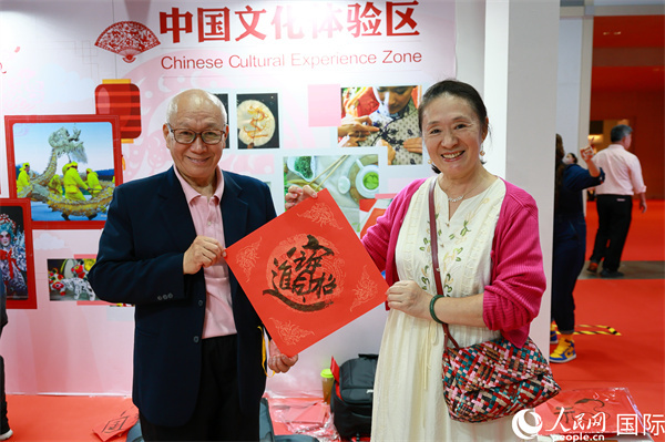 本地觀眾在中國文化體驗區(qū)展示書法作品。人民網記者 白元琪攝