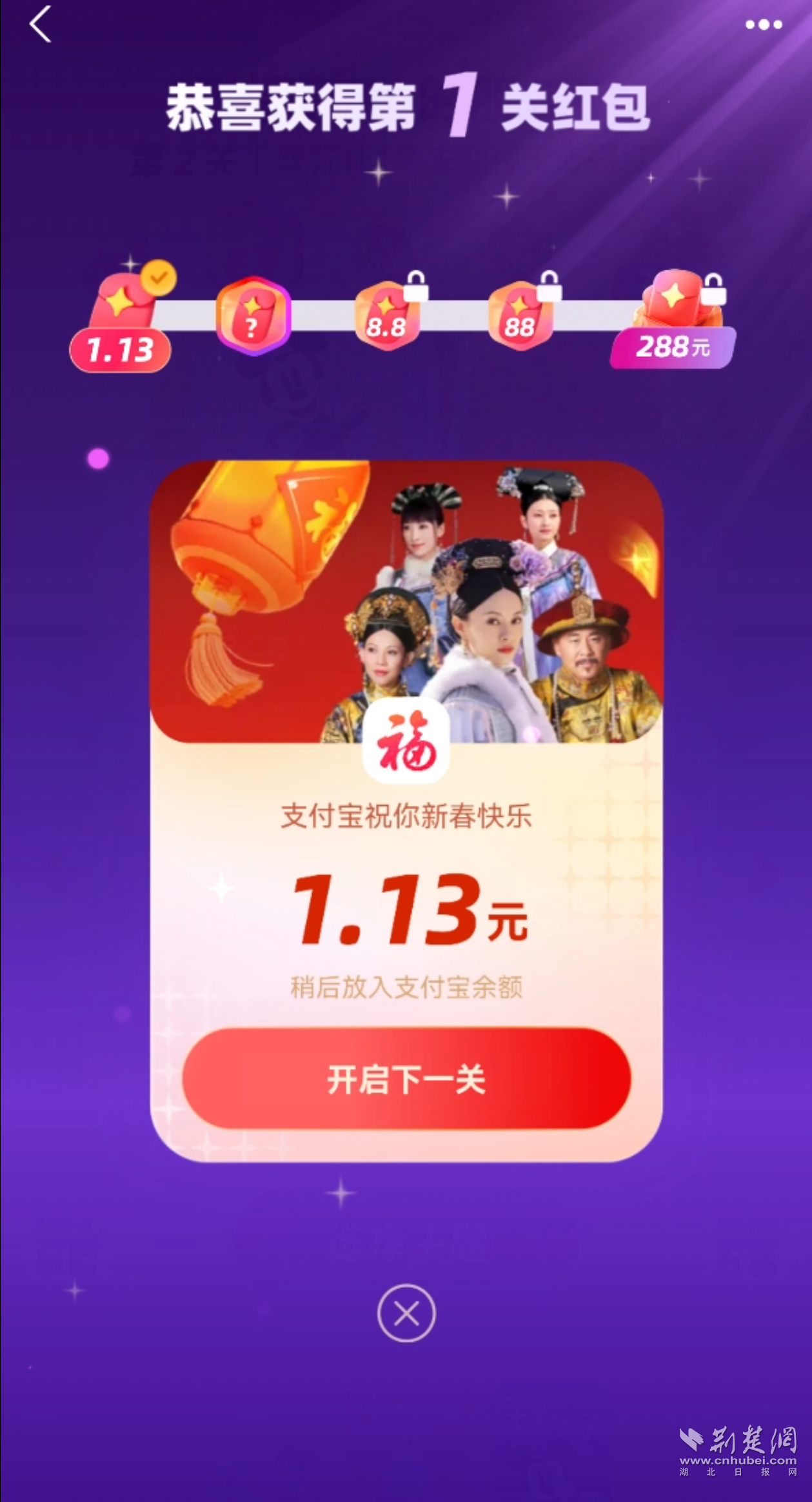 記者大約掃了六七次,就輕松集齊4張卡,合成后獲得了“甄嬛傳”主題的支付寶app的皮膚,領(lǐng)取紅包“開(kāi)啟下一關(guān)”,則可以繼續(xù)闖關(guān)合成開(kāi)獎(jiǎng)。開(kāi)獎(jiǎng)不用等到除夕,并且可以一直集福到大年初五,這也是今年集福最大的變化之一。