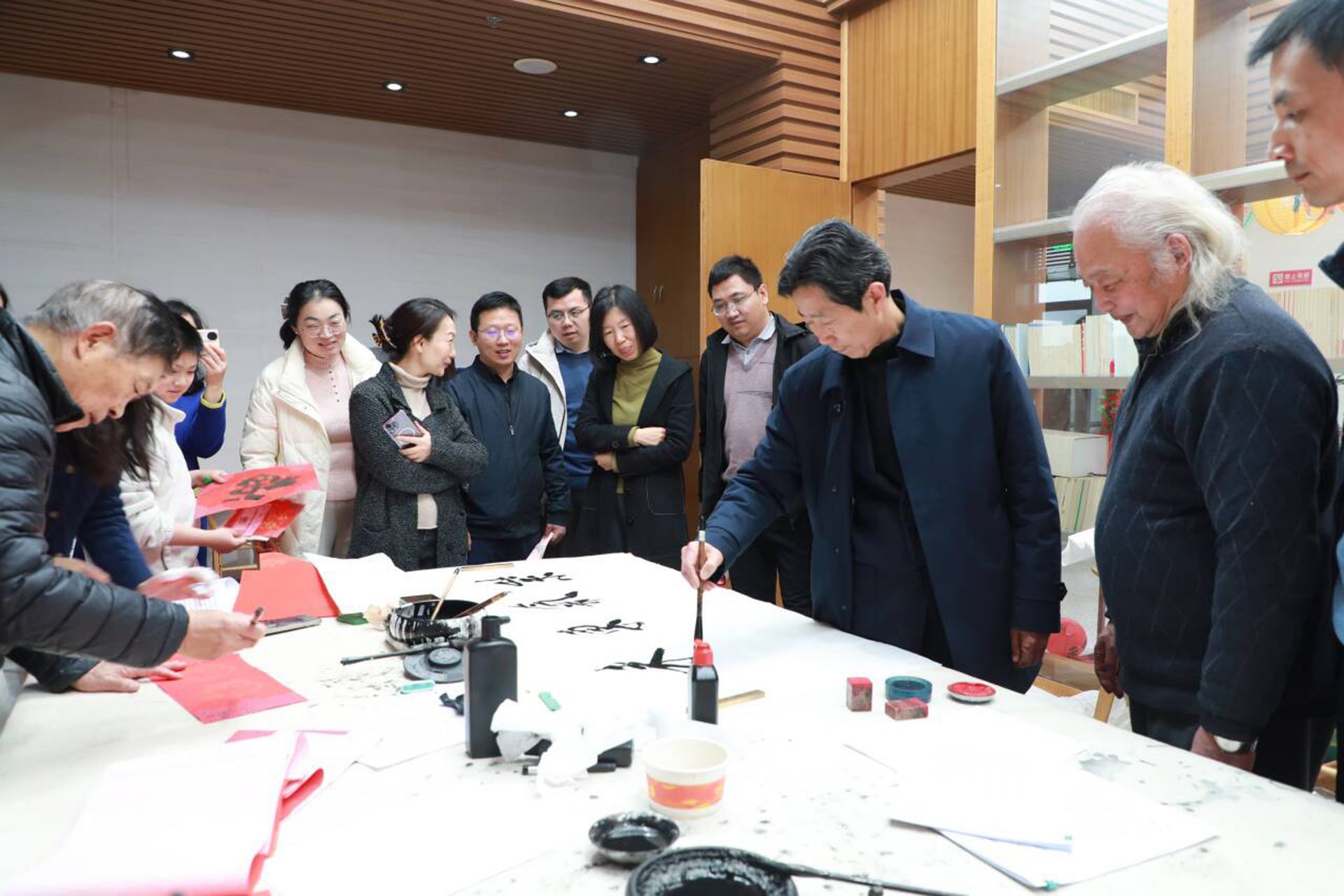 活動(dòng)現(xiàn)場(chǎng)人頭攢動(dòng),氣氛熱烈,墨香四溢。一紙墨香,皆是祥瑞,于黑墨紅紙間感受的是筆墨丹青的獨(dú)特魅力,浸潤(rùn)的是優(yōu)秀的傳統(tǒng)文化,續(xù)寫的是對(duì)未來(lái)的美好期許?!按髱煛眰儞]毫潑墨,筆走龍蛇,將新春的祝福凝聚在墨香里筆尖上,送到干部職工心田里。