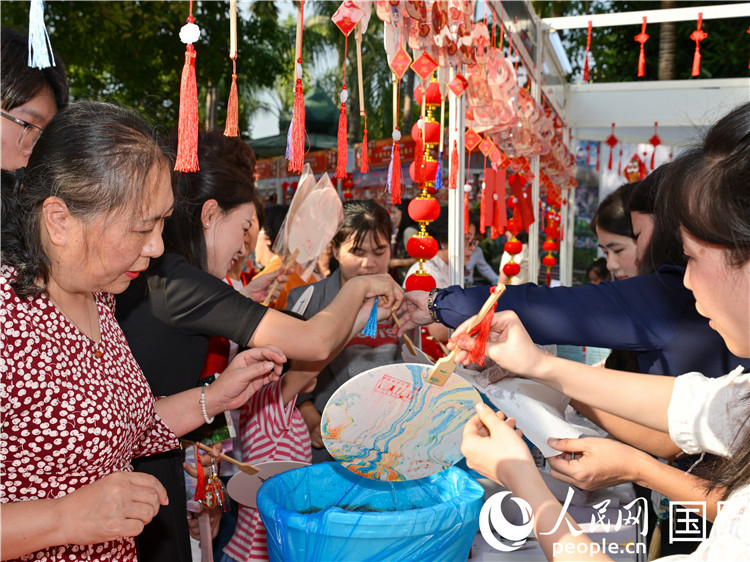 觀眾在“歡樂春節(jié)嘉年華”活動現(xiàn)場體驗漆扇制作。人民網(wǎng)記者 謝佳君攝