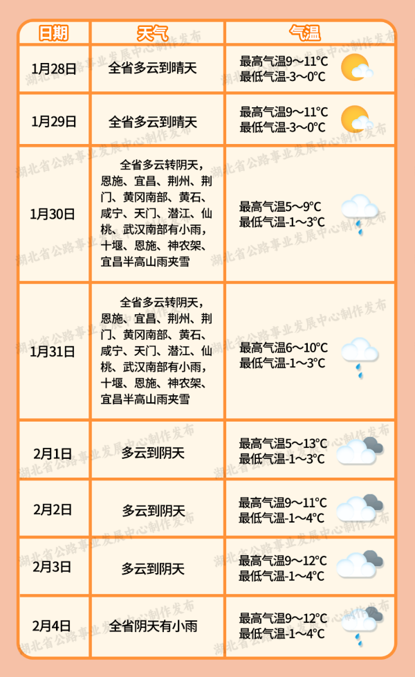 湖北省公路事業(yè)發(fā)展中心經與省氣象服務中心會商研判,預計2025年春節(jié)期間(1月28日-2月4日),全省先晴后雨。其中,1月28日(除夕)至29日(初一),全省以多云到晴天氣為主,氣溫緩慢回升;1月30日(初二)至31日(初三)全省多云轉陰天,南部有小雨,半高山雨夾雪;2月4日(初七)陰天有小雨。請注意防范山區(qū)可能出現(xiàn)的雨雪天氣對交通安全的不利影響。
