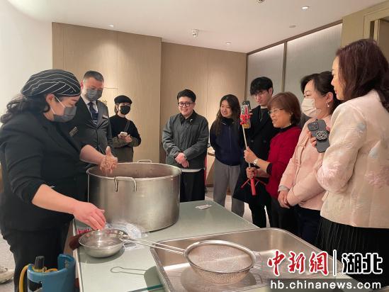 艷陽天酒店的黃燜圓子制作技藝是武漢市非物質(zhì)文化遺產(chǎn)。當(dāng)天,在艷陽天酒店大廚指導(dǎo)下,臺(tái)胞們學(xué)習(xí)制作炸圓子。他們戴上手套,將豬肉、魚茸等調(diào)制而成的餡料擠成丸子形狀,放入鍋中,待炸至金黃撈出,香氣四溢開來。