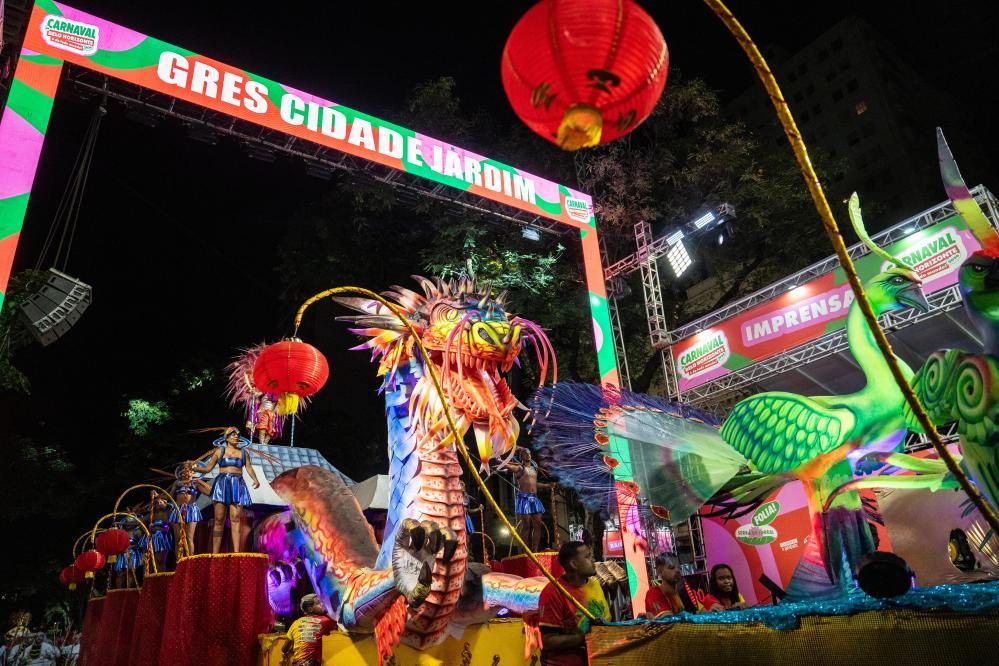 這是2024年2月14日凌晨在巴西貝洛奧里藏特拍攝的“城市花園”舞校的花車(chē)。表演主題為“穿越智慧之路 孔雀遇見(jiàn)龍——巴西-中國(guó)文化之旅”,慶祝巴中建交50周年并致敬中國(guó)龍年。新華社記者 王天聰 攝